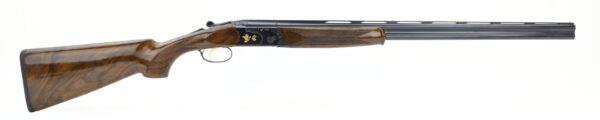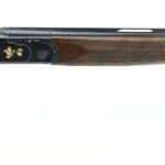 is a beautifully crafted firearm designed for upland hunting. It features the classic 686 low-profile action and a deeply blued receiver with factory engravings, including gold-inlaid quail scenes. The lightweight design and finely checkered select walnut stock contribute to its excellent handling in the field.